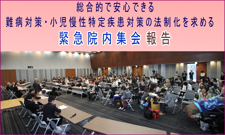 報告、政党、国会議員の激励あいさつ、患者・家族からの発言、緊急院内集会アピールの採択等。
