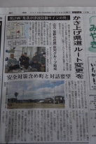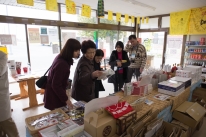 同商店で買い物をするツアー参加者。店主の橋元さんから、かさ上げ県道のルート変更問題の説明を聞いた。詳細は下記に。橋元さんは、県道のルート計画について町と県で責任をなすりつけあっているが、すでに用地買収に入っているという。 |