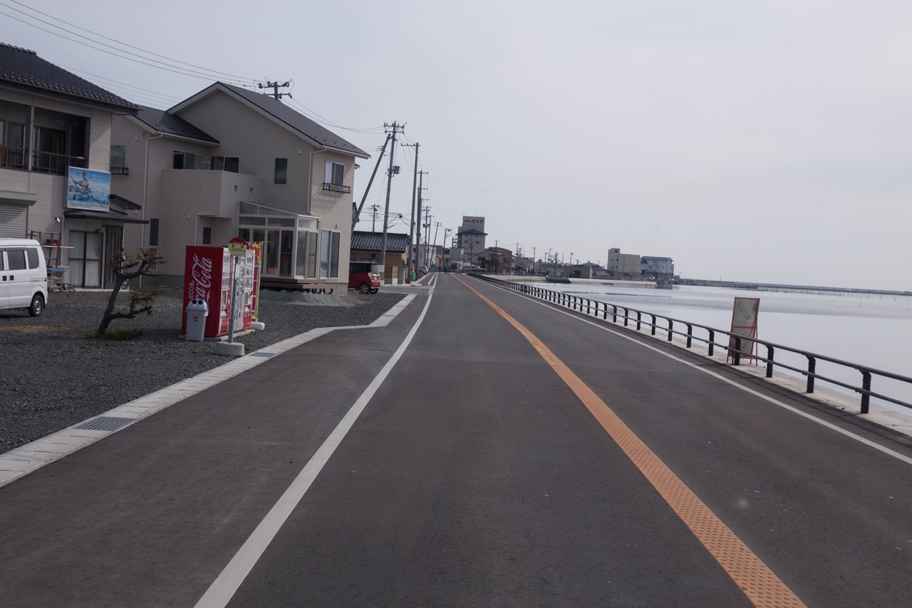 昨年お世話になったみなと屋さんの前。ここもきれいに舗装されていた。昨年は漁港も地盤沈下などの修復工事の最中だったが、今回はすっかりきれいになっていた。(9:23撮影)(福島県相馬市尾浜追川) |