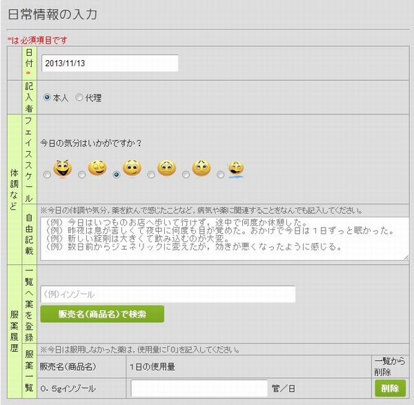 体調、飲んだ薬の記録、体温や血圧など、毎日の健康情報を記入する項目です。